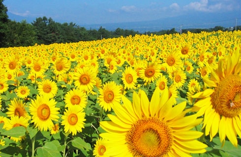 北杜市明野町に60万本のひまわりが咲きほこり、毎年広大な「ひまわり畑」に圧倒される明野サンフラワーフェスをご鑑賞!ひまわりのバックには、南アルプス、八ヶ岳、富士山と雄大な景色が望めます。